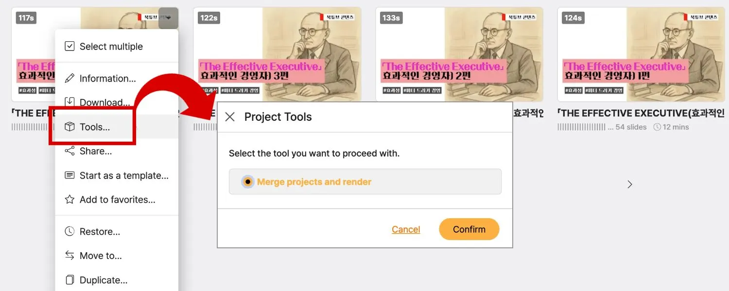 First, create a new project or open a project that you have already worked on. The first thing to do is to specify slides that will be repeatedly used as intros and outros, as well as the thumbnail images. When you click the number in the Slide Window, the 'Slide Note' menu appears. Here, you can assign the role for each slide.