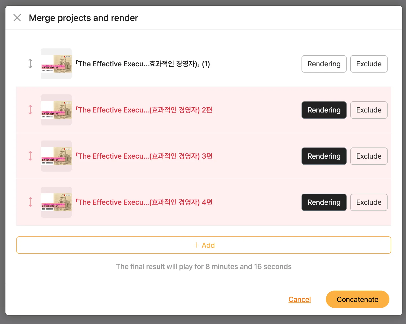 This is a way to merge individually rendered projects into one. Projects that haven't been rendered yet appear with the [Render] button in gray, and you must render the project first.