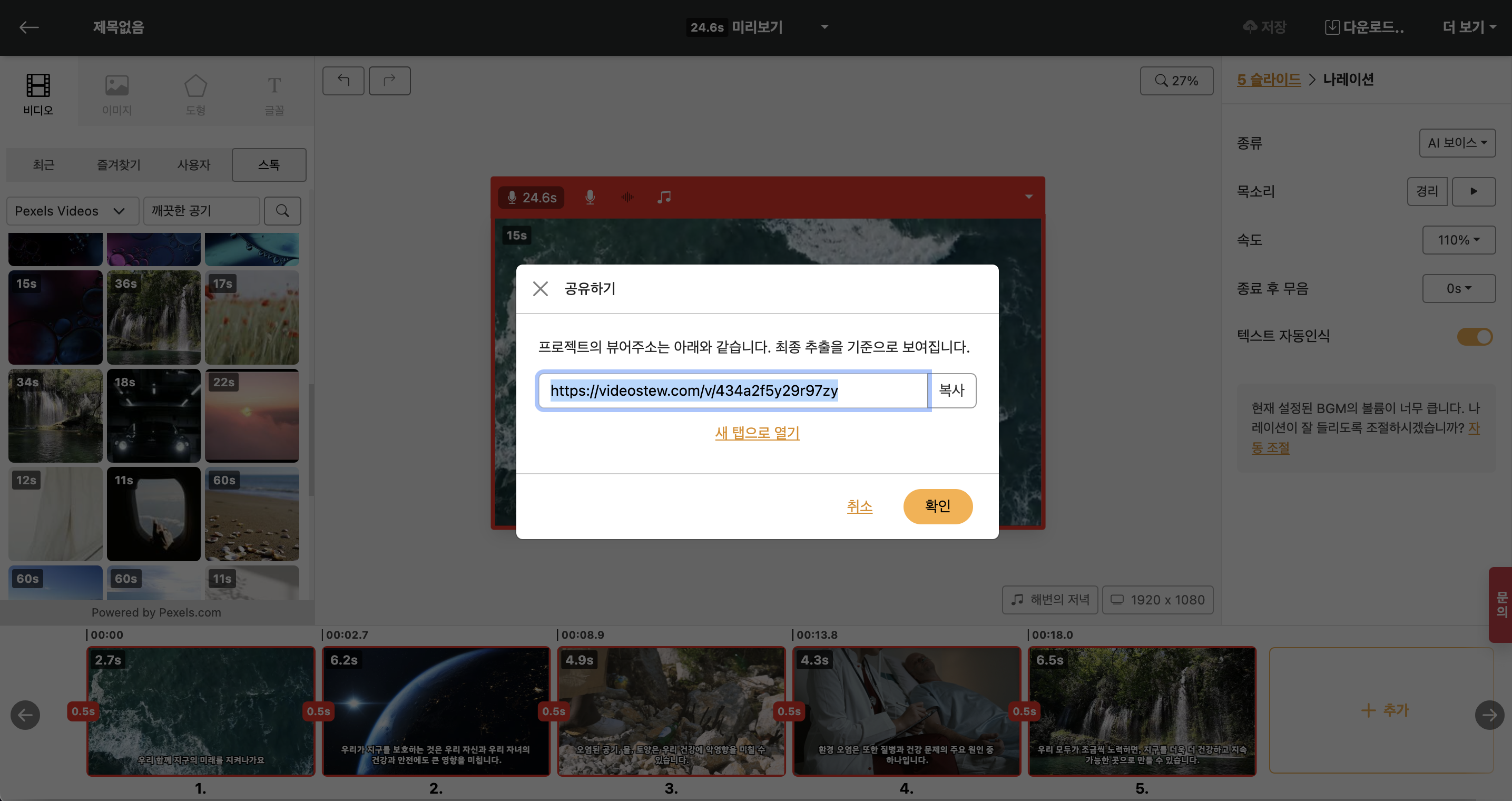 Manual production is all done too! Congratulations!! ?? Did you try downloading to your computer for the first time? This time, practice sharing the completed video without downloading. Just like downloading, press the Download button on the sidebar, and click on [Rendering] in the video. The share URL will be activated once rendering is completed.
