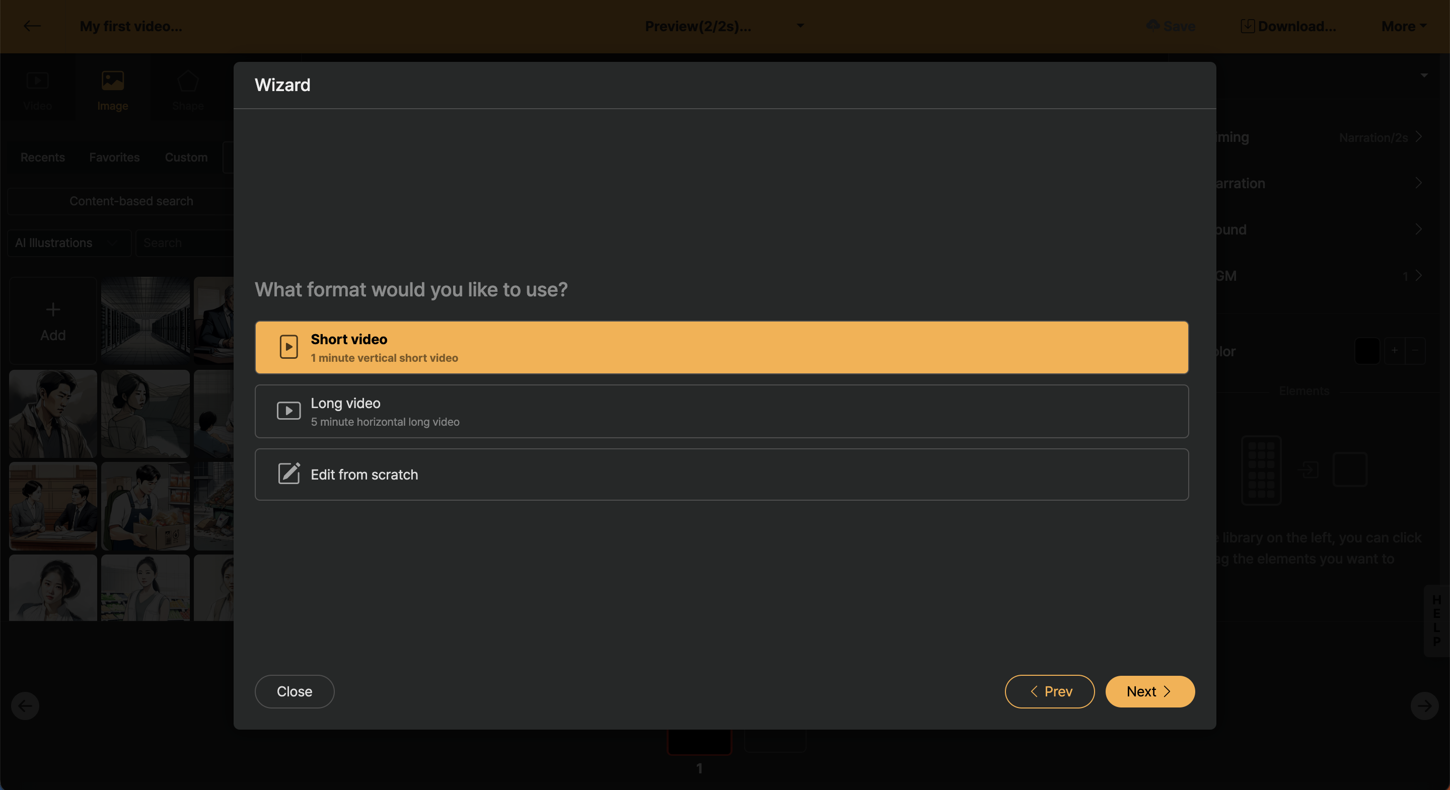 In the next screen, you will adjust the aspect ratio of the video you are going to make. For now, select Short video and proceed to the next step.