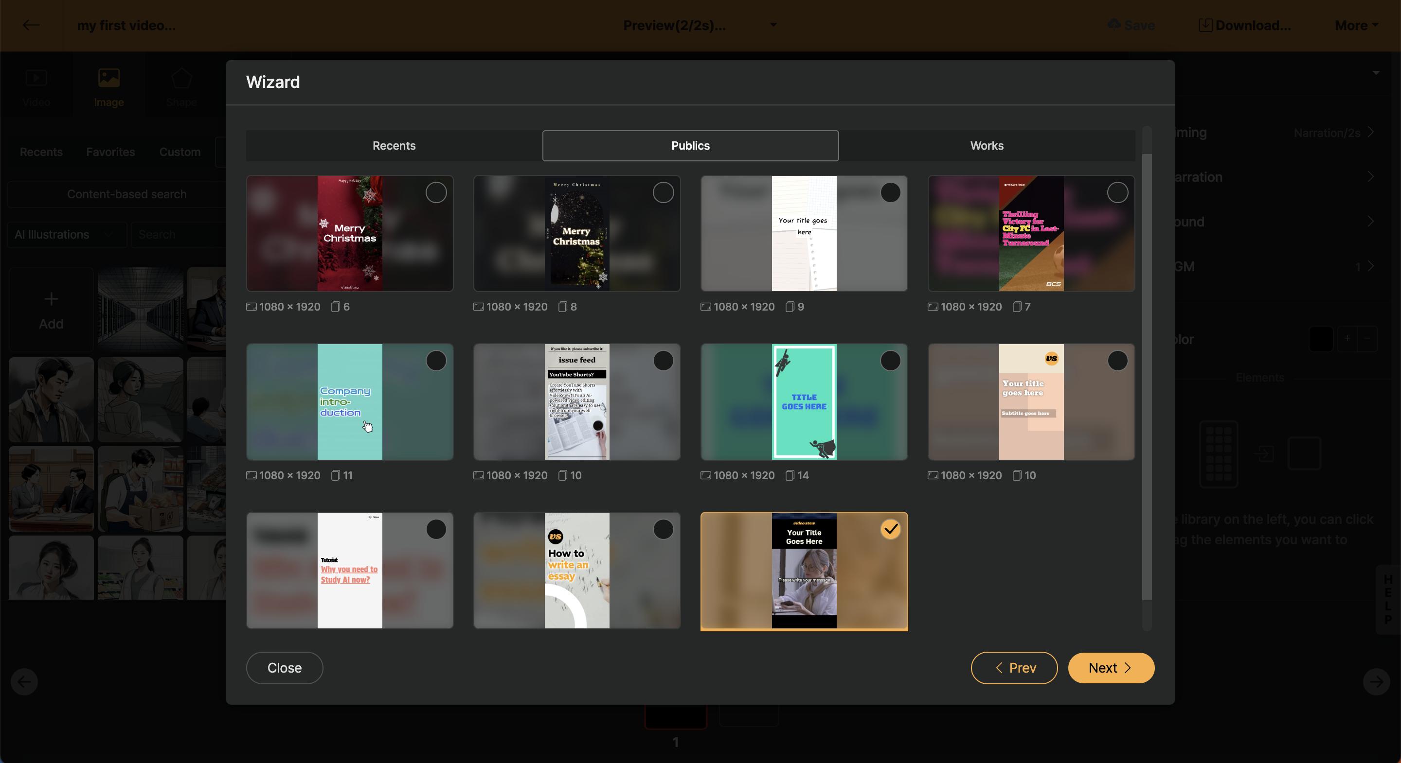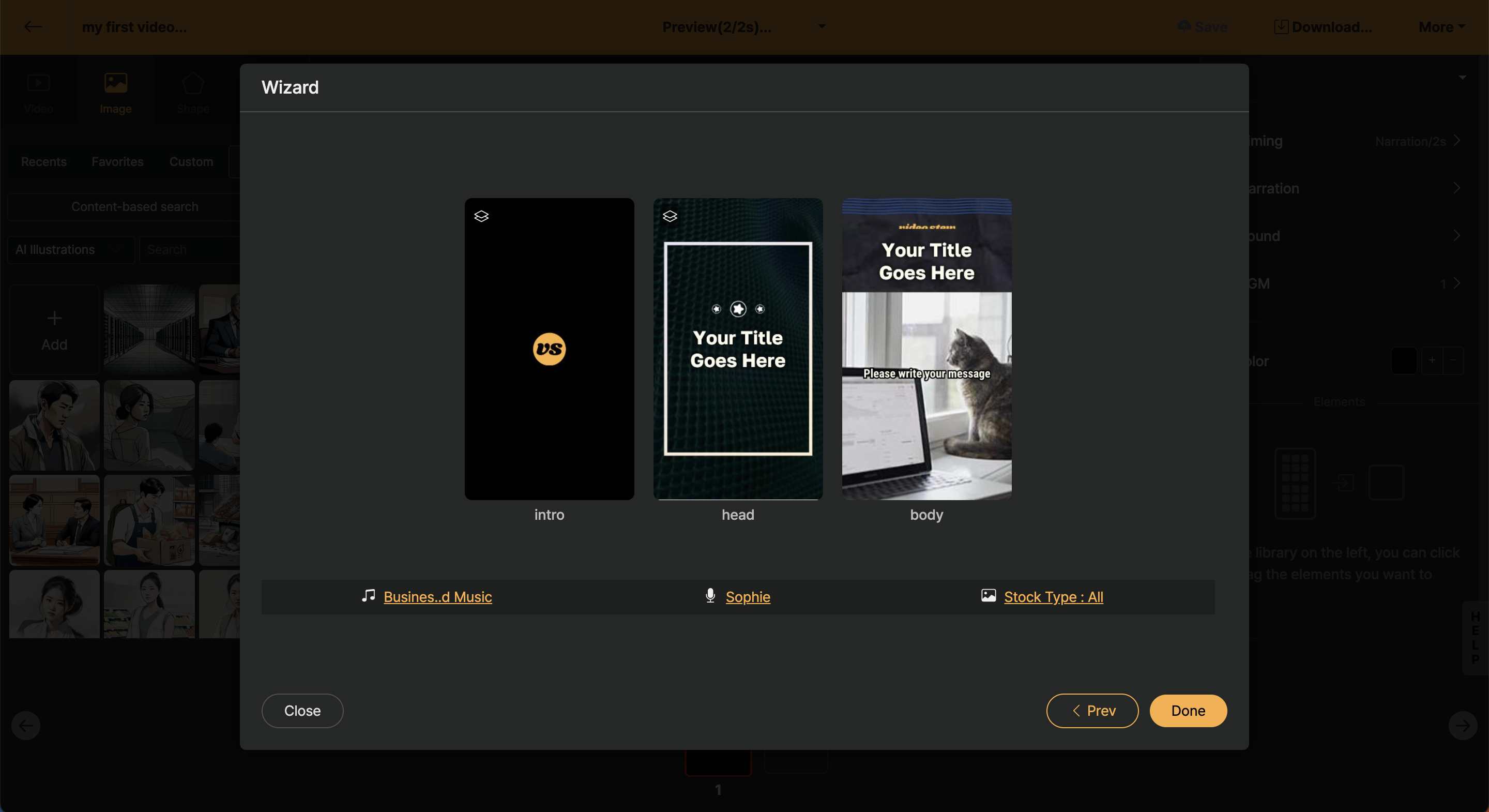 First, select the second slide. Then choose [Video > Stock] from the Library Window on the left side. Select the video you want and drag it to the existing video in the Editing Window in the center. When you release the mouse, it will be replaced with the newly selected image.