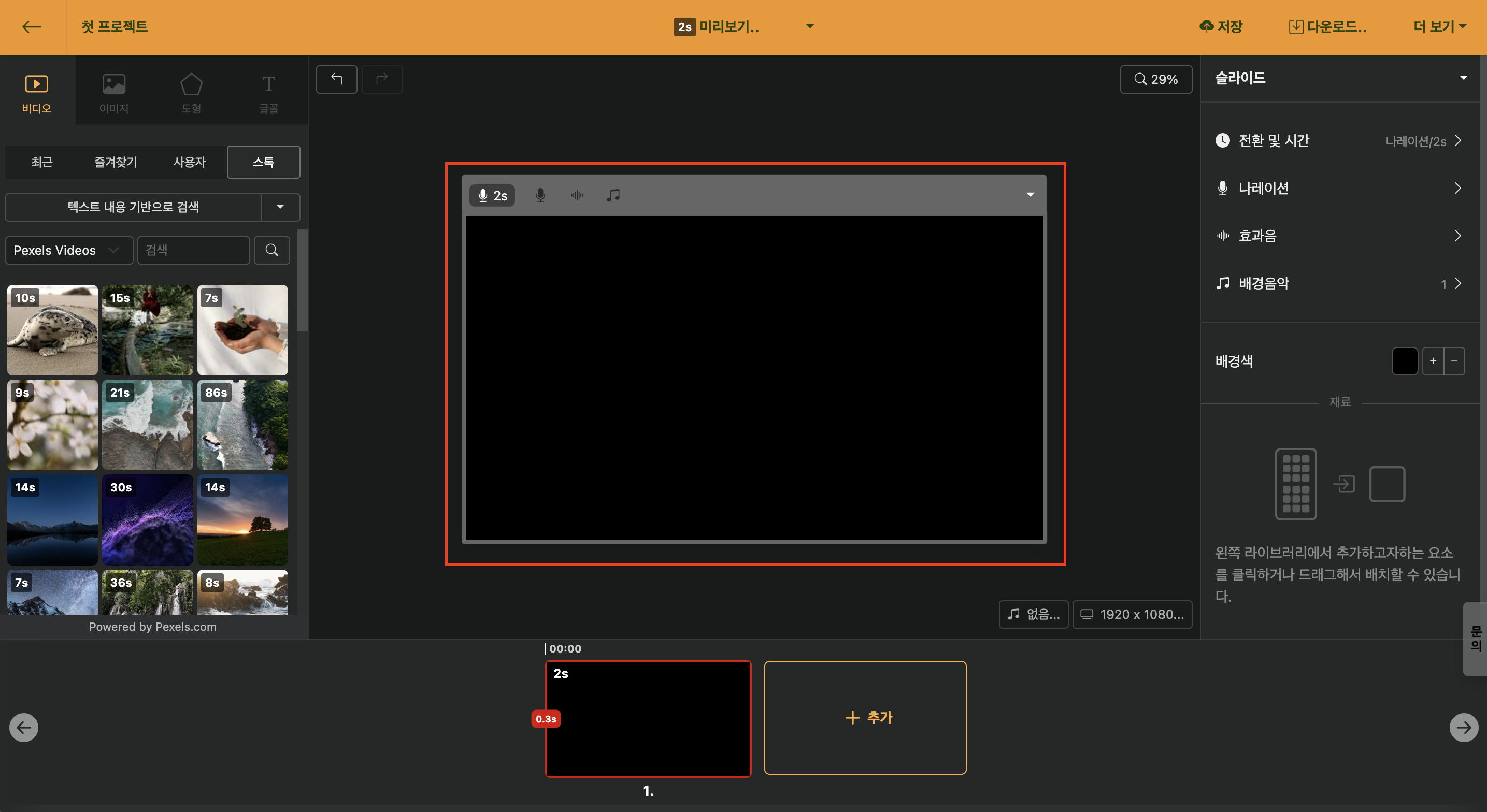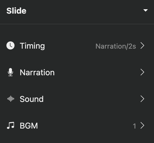 You can change the background music that plays across the entire project, and you can temporarily adjust the volume on this slide. For example, when important content appears or when you need to lower the volume of a video embedded in the slide, you can quickly adjust the volume.