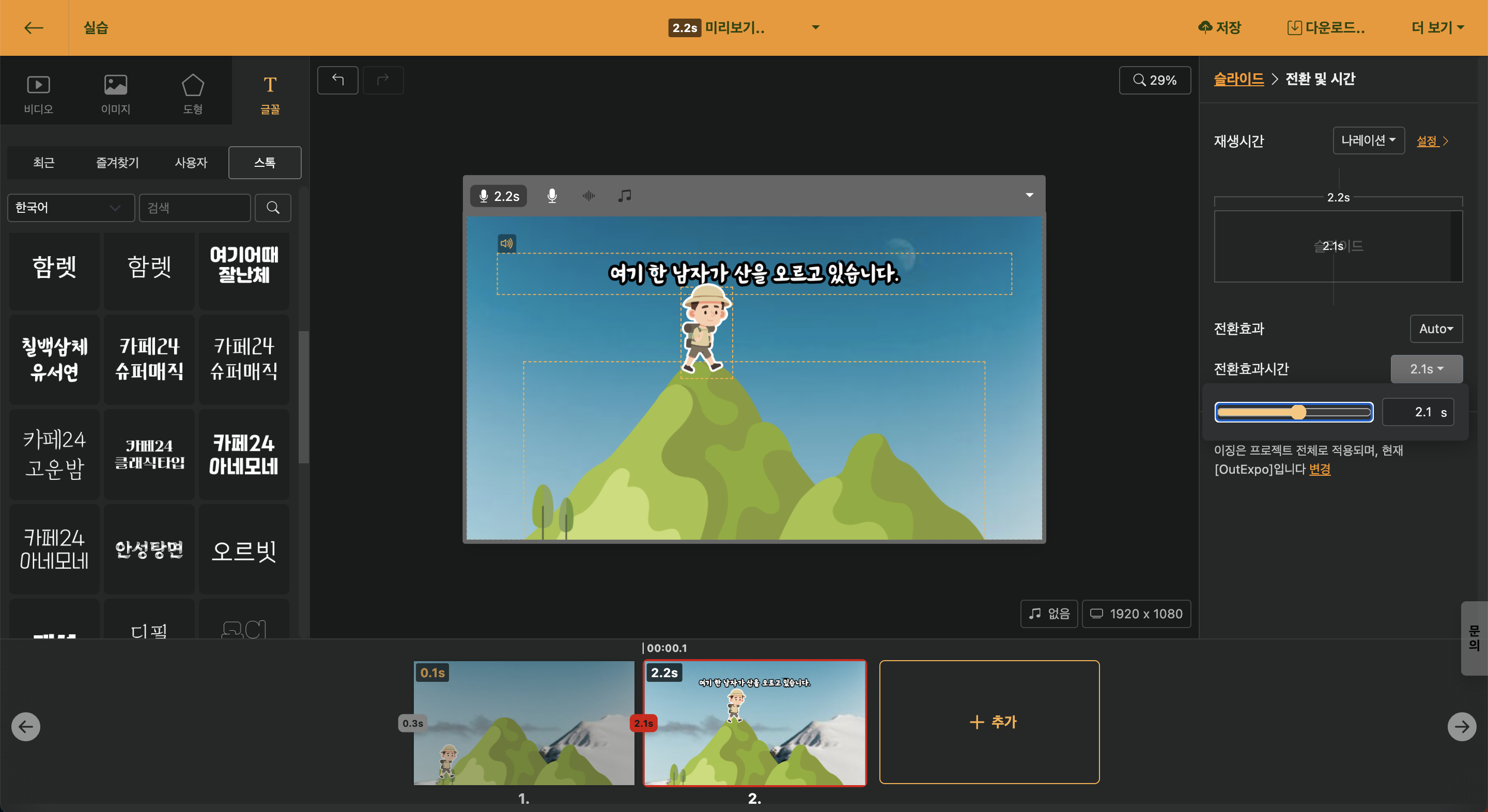 If you preview it here, you will see that the mountaineer quickly reaches the top of the mountain. Precisely, it arrives at the summit in just 0.3 seconds. The reason is the [Transition Duration]. [Transition Duration] is the duration it takes for the animation to activate. Simply put, if you change the [Transition Duration] to 2.2 seconds, the animation will move slowly towards the mountain summit over the course of the narration.